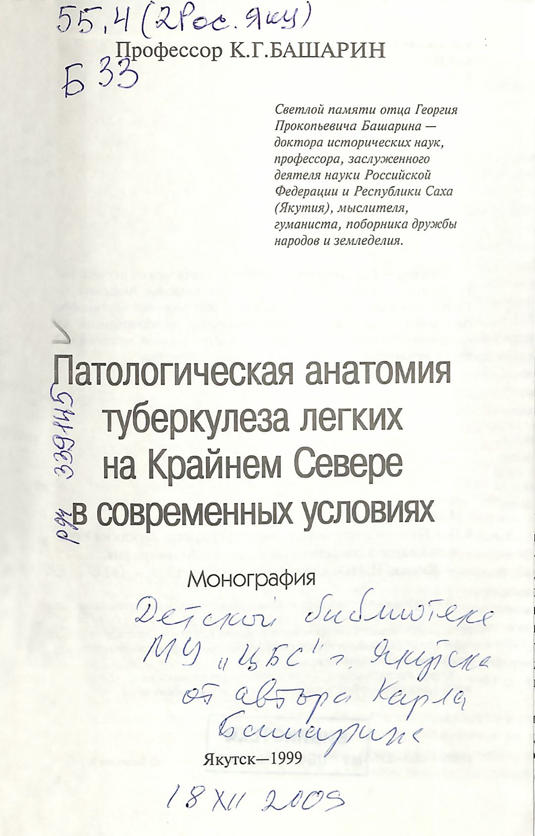 Башарин К.Г. Патологическая анатомия туберкулеза легких на Крайнем Севере в современных условиях: Монография.- Якутск: НИПК Сахаполиграфиздат, 1999.- 192 с.