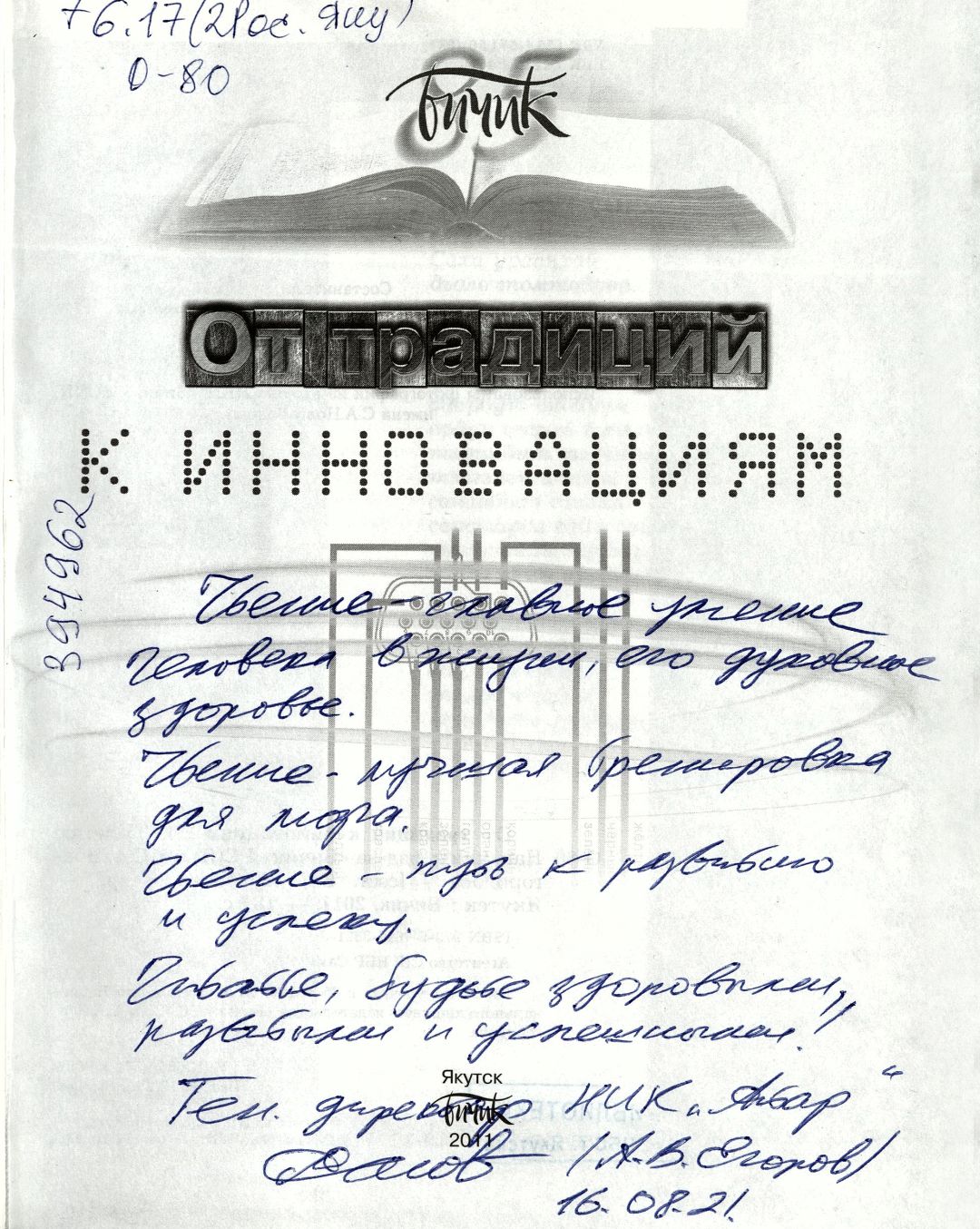 От традиций к инновациям : [к 85-летию Национального книжного издательства "Бичик" РС (Я) им. С. А. Новгородова / сост.: В. Н. Луковцев и др.]. - Якутск : Бичик, 2011. - 183 с.